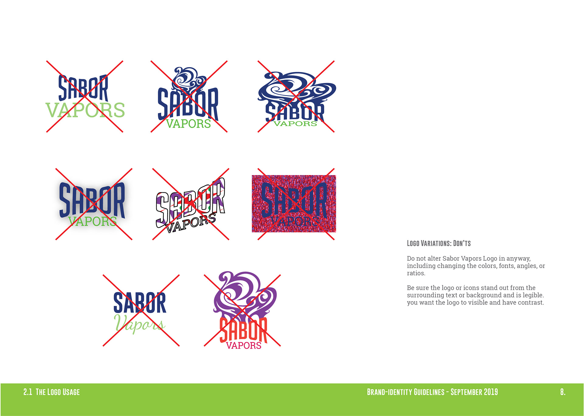 I have previously used Brand Style Guides/Visual Identities Systems before, but this was my first time creating one. I needed time to do some research and make sure I was including all the relevant information, and also have a smooth template for others to follow if needed. I had to be sure to include all the FDA/State regulations since they had created specific rules for packaging eliquid/vapor products. This would be extremely important for future designers to know to not only stay on brand but also design everything legally for Sabor Vapors. This information was constantly changing and being updated.